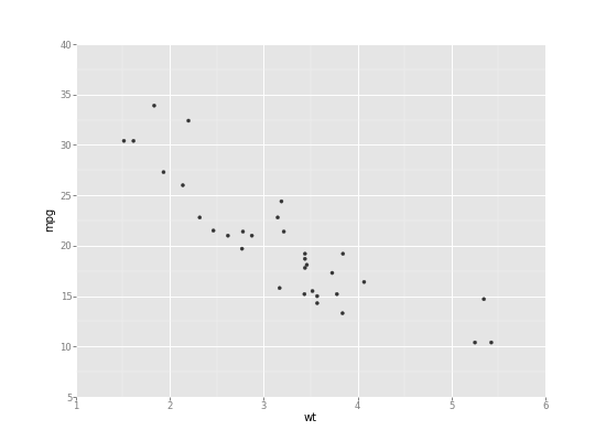 # Rec.2.1 散布図を作成する ggplot(mtcars, aes(x='wt', y='mpg')) + geom_point()