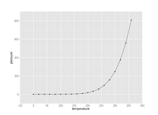 ggplot(pressure, aes(x='temperature', y='pressure')) +geom_line() + geom_point()