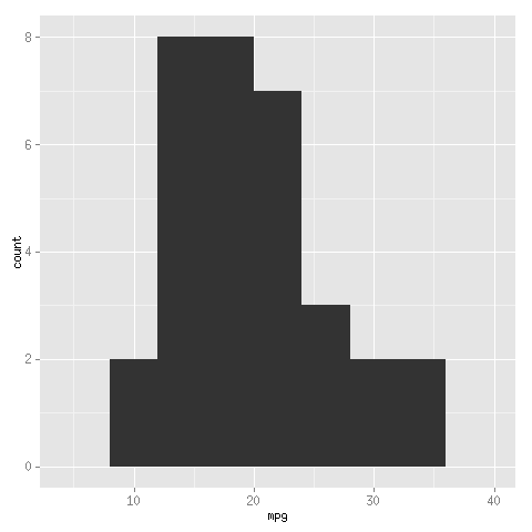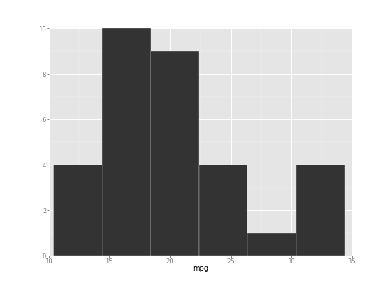 # Rec.2.4 ヒストグラムを作成する ggplot(mtcars, aes(x='mpg')) + geom_histogram(binwidth='4')