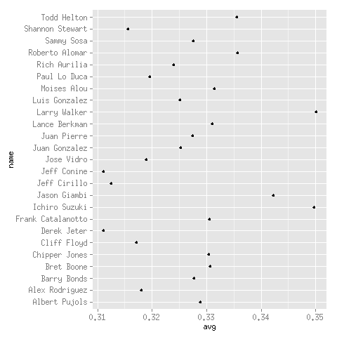 # PDSの手法で、X軸とY軸を入れ替えてみる graph = preGraph("fig-3.29.png") r('p <- ggplot(tophit, aes(x=avg , y=name)) + geom_point(size=3) + coord_flip() + theme(axis.text.x=element_text(angle=60, hjust=1))') r('plot(p)') postGraph(graph)