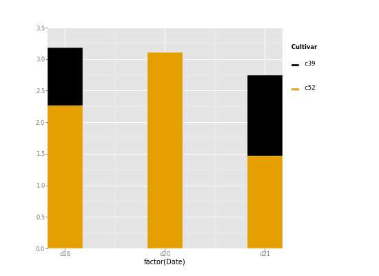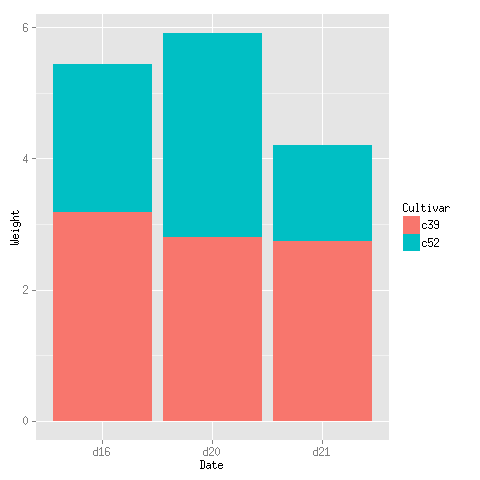 # Rec.3.7 積み上げ棒グラフを作成する graph = preGraph("Rec.3.7.png") r('p <- ggplot(cabbage_exp, aes(x=Date, y=Weight, fill=Cultivar)) + geom_bar(stat="identity")') r('plot(p)') postGraph(graph)