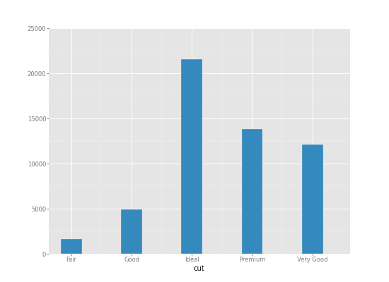 # Rec.3.3 個数を示す棒グラフを作成する ggplot(diamonds, aes(x='cut')) + geom_bar()