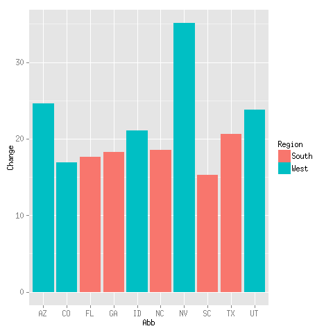 # Rec.3.4 色つきの棒グラフを作成する r('upc <- subset(uspopchange, rank(Change)>40)') graph = preGraph("Rec.3.4.png") r('p <- ggplot(upc, aes(x=Abb, y=Change, fill=Region)) + geom_bar(stat="identity")') r('plot(p)') postGraph(graph)