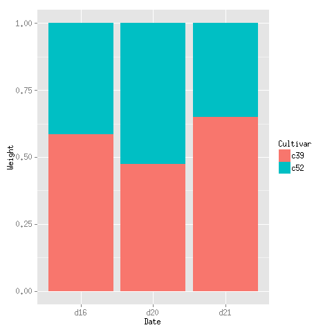 # Rec.3.8 100%積み上げ棒グラフ(Practical Data Science版) graph = preGraph("Rec.3.8.png") r('p <- ggplot(cabbage_exp) + geom_bar(aes(x=Date, y=Weight, fill=Cultivar), position="fill")') r('plot(p)') postGraph(graph)