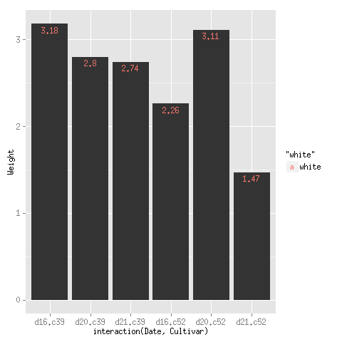 # Rec.3.9 棒グラフにラベルを追加する vjustでラベルの位置を調整 # python版はダメ # ggplot(cabbage_exp, aes(x='factor(Date)', weight='Weight')) + geom_bar() + geom_text(aes(y='Weight', label='Weight')) graph = preGraph("Rec.3.9.png") r('p <- ggplot(cabbage_exp, aes(x=interaction(Date, Cultivar) , y=Weight)) + geom_bar(stat="identity")+ geom_text(aes(label=Weight, vjust=1.5, colour="white"))') r('plot(p)') postGraph(graph)