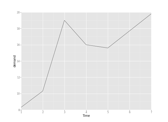 # Rec.4.1 基本的な折れ線グラフを作成する(Python版) ggplot(BOD, aes(x='Time', y='demand')) + \ geom_line()