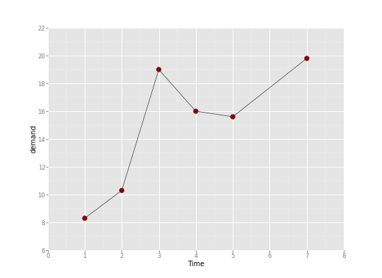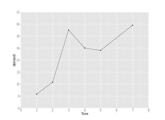 # Rec4.2 折れ線グラフに点を追加する(Python版) ggplot(BOD, aes(x='Time', y='demand')) + \ geom_line() + geom_point()