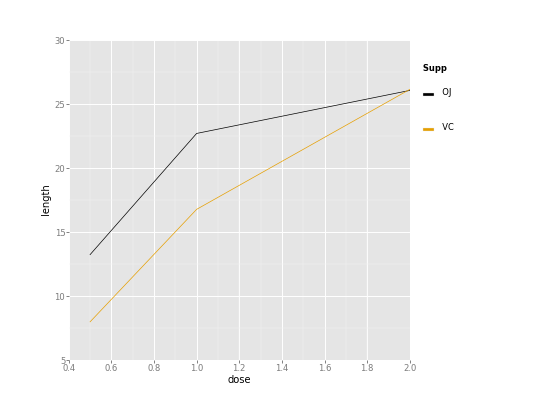 ggplot(tg, aes(x='dose', y='length', colour='supp')) + \ geom_line()