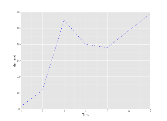 Time demand 0 1 8.3 1 2 10.3 2 3 19.0 3 4 16.0 4 5 15.6 [5 rows x 2 columns]