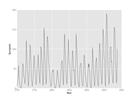 ggplot(sunspotyear, aes(x="Year", y="Sunspots")) + geom_line()