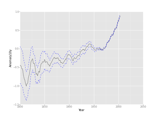 ggplot(clim, aes(x="Year", y="Anomaly10y")) + \ geom_line() + \ geom_line(aes(x="x", y="y"), linestyle="dashed", color="blue", data=up_line) + \ geom_line(aes(x="x", y="y"), linestyle="dashed", color="blue", data=lw_line)