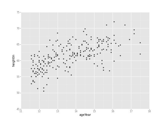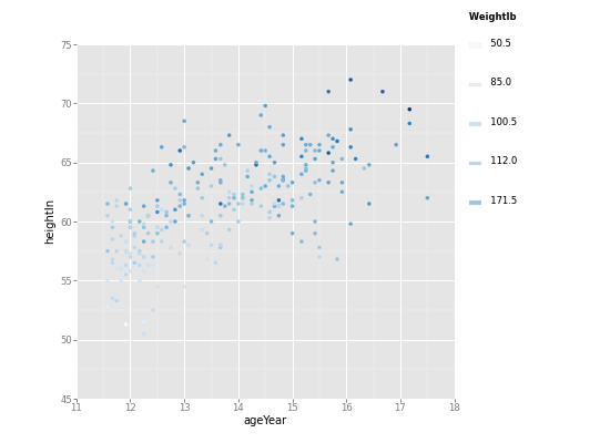 ggplot(heightweight, aes(x="ageYear", y="heightIn", size="weightLb")) + geom_point()