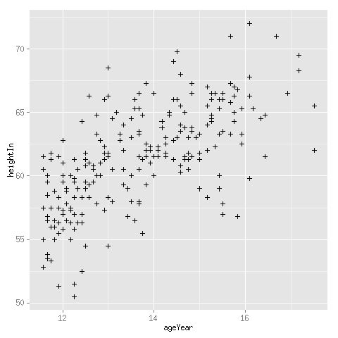 # R版 graph = preGraph("Rec.5.3.png") r('p <- ggplot(heightweight, aes(x=ageYear, y=heightIn)) + geom_point(shape=3)') r('plot(p)') postGraph(graph)
