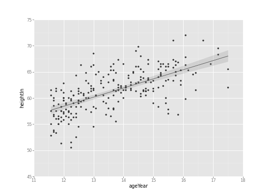 # Rec.5.6 回帰モデルの直線をフィットさせる ggplot(heightweight, aes(x="ageYear", y="heightIn")) + geom_point() + stat_smooth(method="lm", se=True)