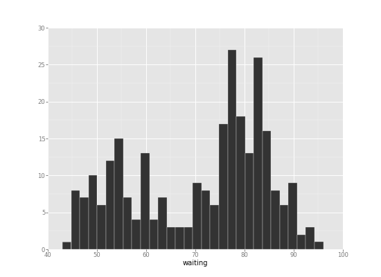 # Rec.6.1 基本的なヒストグラムを作成する faithful = RDf2PandaDf('faithful') ggplot(faithful, aes(x="waiting")) + geom_histogram()