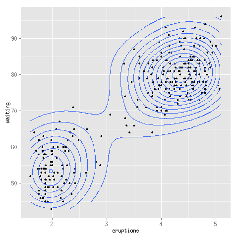# Rec.6.12 2次元データから密度プロットを作成する graph = preGraph("Rec.6.12.png") r('p <- ggplot(faithful, aes(x=eruptions, y=waiting)) + geom_point() + stat_density2d()') r('plot(p)') postGraph(graph)