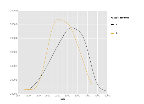 # Rec.6.4 グループ化されたデータから複数の密度曲線を作成する ggplot(birthwt, aes(x="bwt", colour="factor(smoke)")) + geom_density()