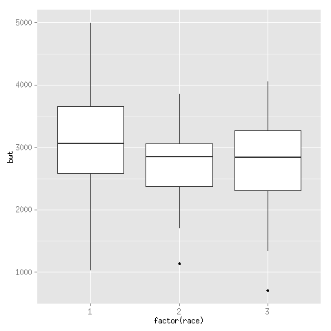 # Rec.6.6 基本的な箱ひげ図を作成する graph = preGraph("Rec.6.6.png") r('p <- ggplot(birthwt, aes(x=factor(race), y=bwt)) + geom_boxplot()') r('plot(p)') postGraph(graph)