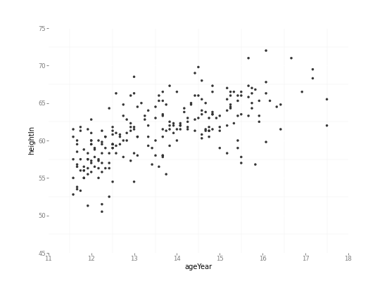 # Rec.9.3 テーマを使う # ブラックとホワイトのテーマ ggplot(heightweight, aes(x="ageYear", y="heightIn")) + geom_point() + theme_bw()