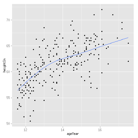 # Rの結果は graph = preGraph("fig-5.19-1.png") r('p <- ggplot(heightweight, aes(x=ageYear, y=heightIn)) + geom_point() + stat_smooth()') r('plot(p)') postGraph(graph)