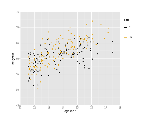 # R5.2 色と形を使用してデータポイントをグループ化 ggplot(heightweight, aes(x="ageYear", y="heightIn", color="sex")) + geom_point()