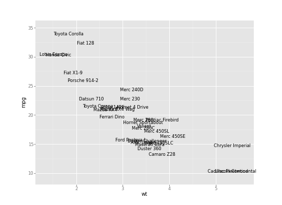 # geom_textは実装されているが、文字列のプロットのみをサポート ggplot(aes(x='wt', y='mpg', label='name'), data=mtcars) + \ geom_text()
