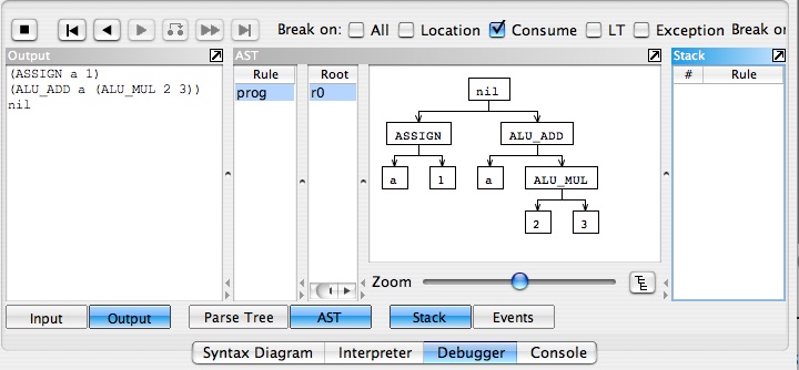 このようにANTLRWorksを使って簡単に構文木解析のプログラムもデバッグできます。