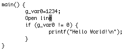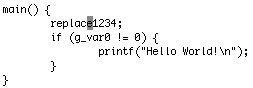 図10を使ってカーソル移動を説明します。変数g_var0のgの位置にカーソルがあり、wを続けて入力することで、 カーソルが=, 1, ;に移動します(図11-a, 11-b, 11-c参照)。 今度は、;の位置でbを入力すると1, =, gとword単位逆方向に移動します。