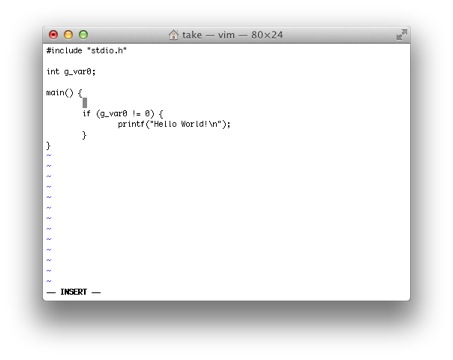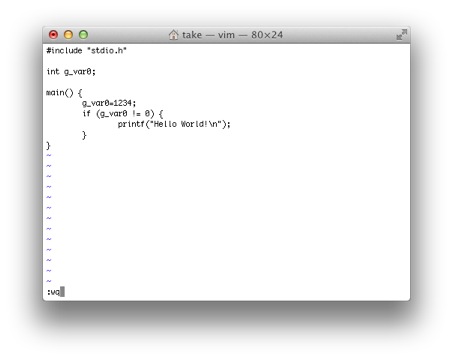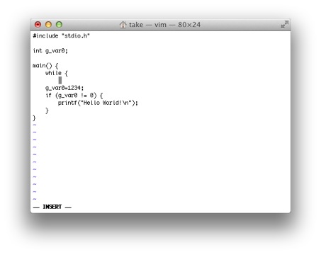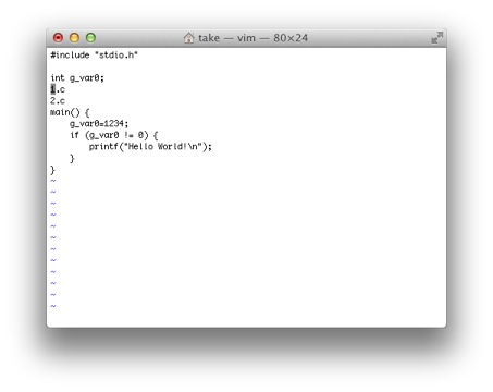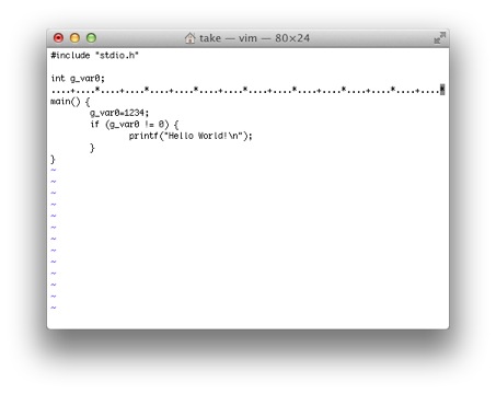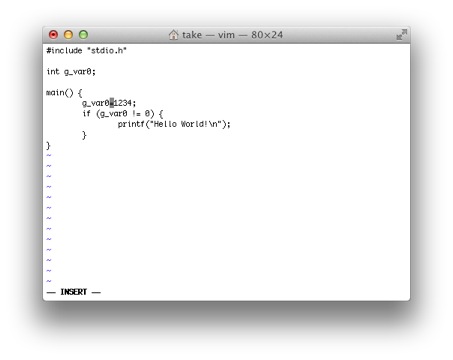 'はマーク参照コマンドでマークコマンドmでマークされた場所にカーソルを移動するのに使います。 試しに3行目のint g_var0のiにカーソルを移動し、maと入力します。これでiの場所がaというマーク名で記憶されます。 *10