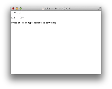 例として、カレントディレクトリのファイル一覧を表示してみます。 :! lsに続いて改行を入力するとlsの結果が表示され、Press ENTER or type command to continueのメッセージがでますので、 改行を入力すると元の画面に戻ります。