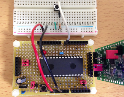 DigitalInでは、以下のようにタクトスイッチに10KΩの抵抗でプルアップした回路を組み、スイッチを押したときに LEDを点灯するプログラムを作成して、動作を確認しました。