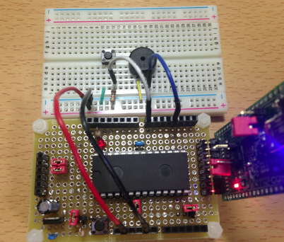 以下の様にタクトスイッチを押すと圧電ブザーがなるようにブレッドボードで回路を組みます。