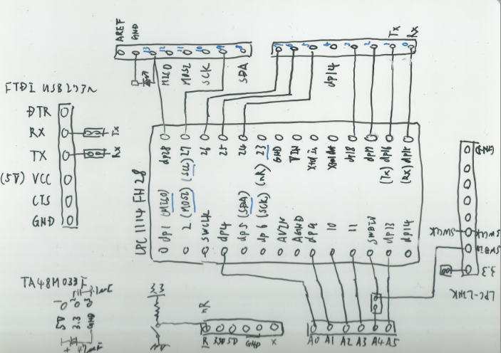 ピンの使い方は、mbed LPC1114FN28を参考にしました。