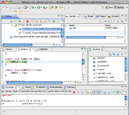 デバッガーを使用する場合には、Cコンパイラーのオプションからオプティマイズ(-O1)を外し、 再度、makeを実行してください。