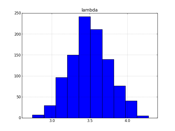 # Pandasのグラフ機能を使ってヒストグラムを表示する(ggplotのヒストグラムはバグありみたいだから) df3000 = pd.DataFrame({ 'lambda': np.array(poisSet3000)}); df3000.head()