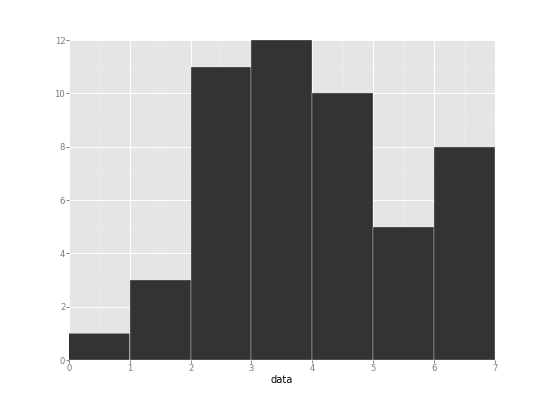 # Sageにはヒストグラムをプロットする関数がないので、ggplotを使用する # 50個の度数になるようにprob*50としてプロットしている ggplot(orgData, aes(x='data')) + geom_histogram(binwidth=1)