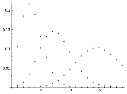 # 様々な平均(λ)のポアソン分布 # Fig. 2.6 g = Graphics() for lam, cls in [(3.5, 'red'), (7.7, 'blue'), (15.1, 'green')]: g = g + list_plot([p(y, lam) for y in range(20)], color=cls) g.show(figsize=5)