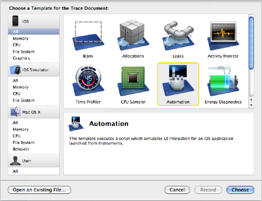 Automationは、XCodeのInstrumentsのライブラリとして提供されています。