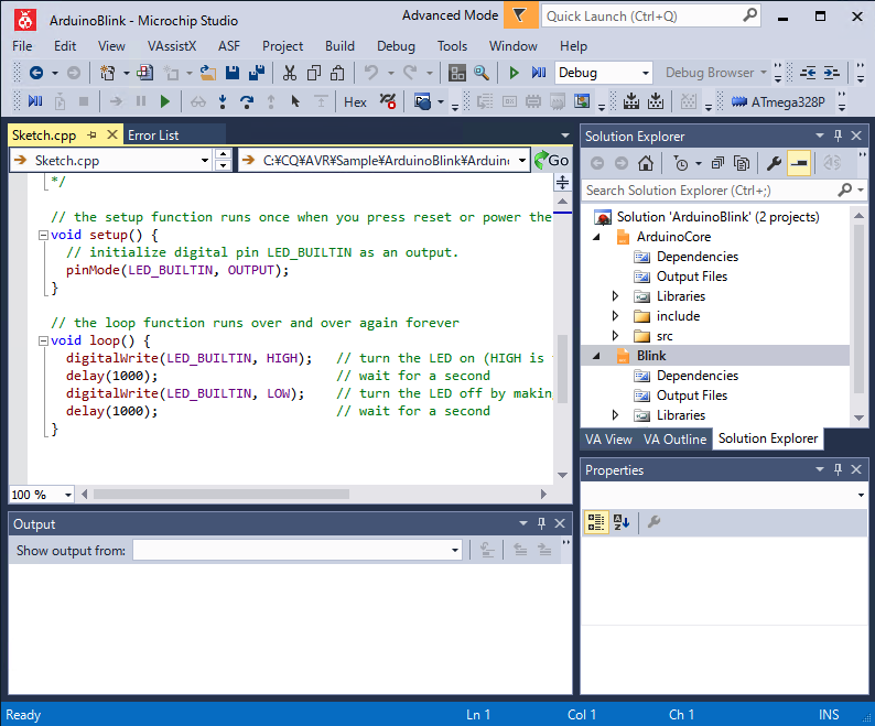 インポートするArduinoのスケッチを指定し、ボードのタイプ、CPUデバイスをセットしてOKボタンを押下します。 必要なライブラリも合わせてインポートされ、Microchip Stduioのプロジェクト画面が表示されます。