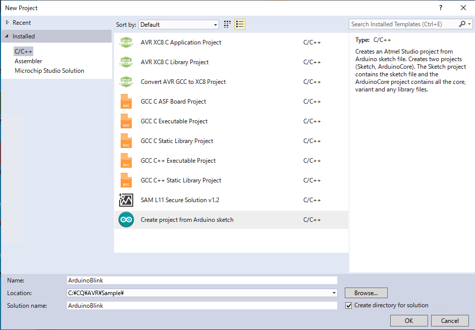 Arduinoプロジェクトの作成画面では、「Create project from Arduino sketch」を選択し、プロジェクト名称、作成ディレクトリを入力して、OKボタンを押下します。
