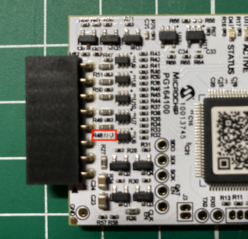 技術2021年4月号の写真2(43p)は、少し古いモデルみたいで、私が秋月から購入したものはR48の位置が少し異なっていました。 隙間が狭くピンセットが入らなかったので、チップ抵抗にコテを当てた後ドライバーでずらして、取り外しました。