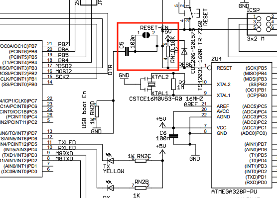Arduino UNOの互換器では、CR回路がボードに直付けになっており、切り離すことができません。
