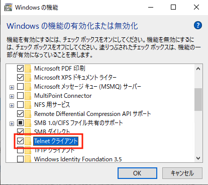Windows10は、そのままではtelnetコマンドが使えません。Windowsの機能画面を開き、「Windowsの機能の有効化または無効化」を選択し、「Telnetクライアント」にチェックを付け、「OK」ボタンをクリックしてください。
