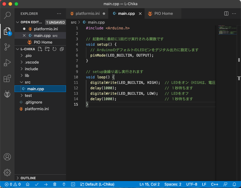 続いてLチカのスケッチを描きましょう。EXPLORERリストの「src」の中の「main.cpp」をクリックするとArduinoのデフォルトスケッチが表示されますので、以下のLチカスケッチをコピー&ペーストしてください。