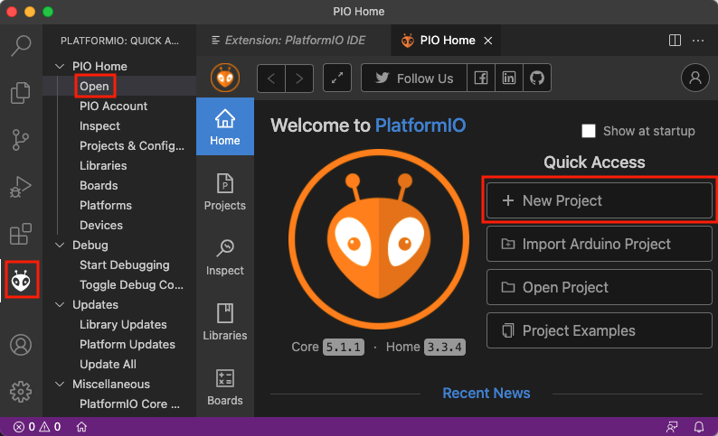 新規のプロジェクトを作成するには、このアイコンをクリックし、「PIO HOME」リストから「Open」を選択すると、以下の画面が表示されます。ここで、「New Project」ボタンをクリックしてください。