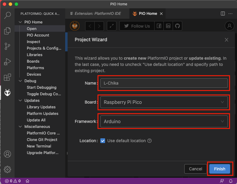 Project Wizard画面に切り替わりますので、プロジェクトの名前をName:フィールドに「L-Chika」と入力し、Boardフィールドには「pico」と入力すると候補が表示されますので「Rasperry Pi Pico」を選択します。Frameworkフィールドには「Arduino」が表示されます。入力が完了したら「Finish」ボタンをクリックしてください。プロジェクトの作成には時間がかかりますので、お茶でも飲みながら待ってください。
