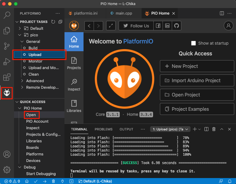 PlatformIOでスケッチをアップロードするには、PlatformIOアイコンをクリックし、QUICK ACCESS>PIO HOMEの中のOpenを選択し、PROJECT TASK>pico>Generalの中のUploadを選択してください。 (以前はすぐにUploadの選択だけでよかったのですが、現在のバージョンではPIO Homeがアクティブの状態でないとUploadが実行されません)