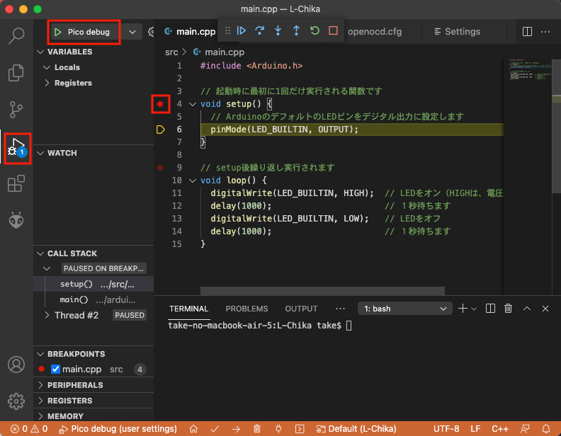 準備が整ったで、Lチカ・スケッチをデバッガーで動かしてみましょう。 (MacOSXの人は、これで毎回BOOTSELボタンを押してスケッチを書き込むなくてもよくなります。)