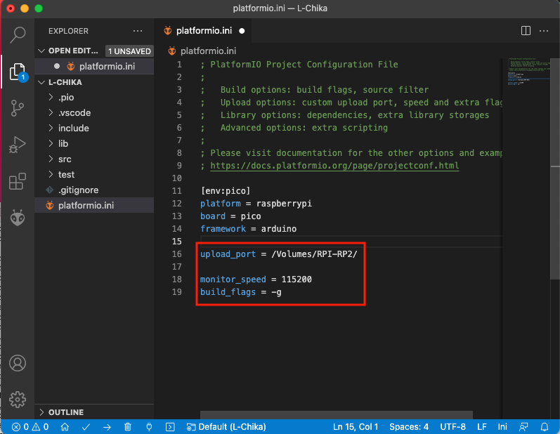 プロジェクトが作られると以下のようなplatformio.iniファイルが表示されるます。 このファイルでプロジェクトの設定を行います。