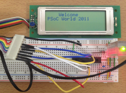 void main(void) { // M8C_EnableGInt ; // Uncomment this line to enable Global Interrupts // Insert your main routine code here. char str[] = "Welcome"; int i = 0x2011; LCD_1_Start(); LCD_1_Position(0, 4); LCD_1_PrString(str); // RAM文字列表示 LCD_1_Position(1, 0); LCD_1_PrCString("PSoC World"); // ROM文字列PSoC Worldを表示 LCD_1_Position(1, 11); LCD_1_PrHexInt(i); // 2バイト16進数を表示 }